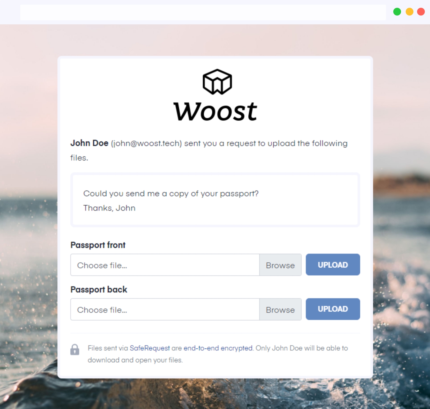 SafeRequest is built to provide uploaders ‐your customers‐ an experience as smooth as possible. They can easily upload the requested files via a personally styled page.